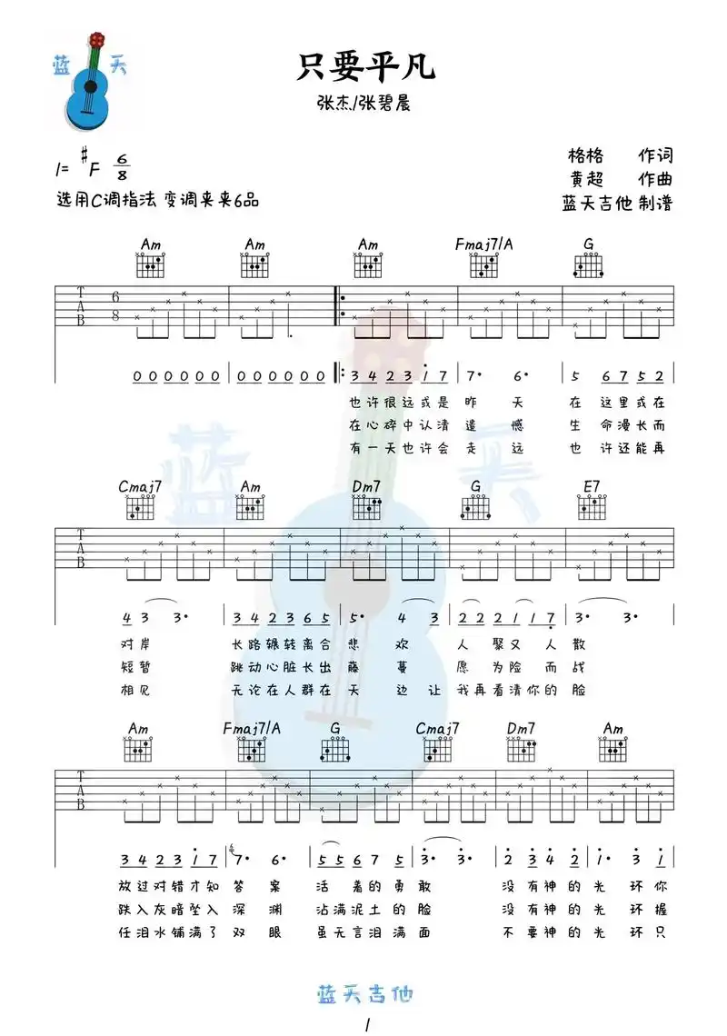 张杰vs张碧晨只要平凡吉他谱,简单选用原版指弹曲谱,张杰高清六线乐谱