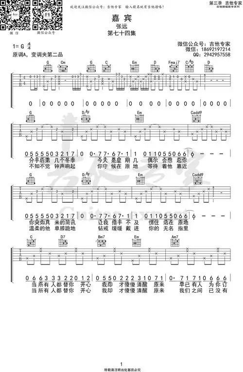 张远__嘉宾_g调原版弹唱六线谱_高清图片谱_吉他谱_钢琴谱